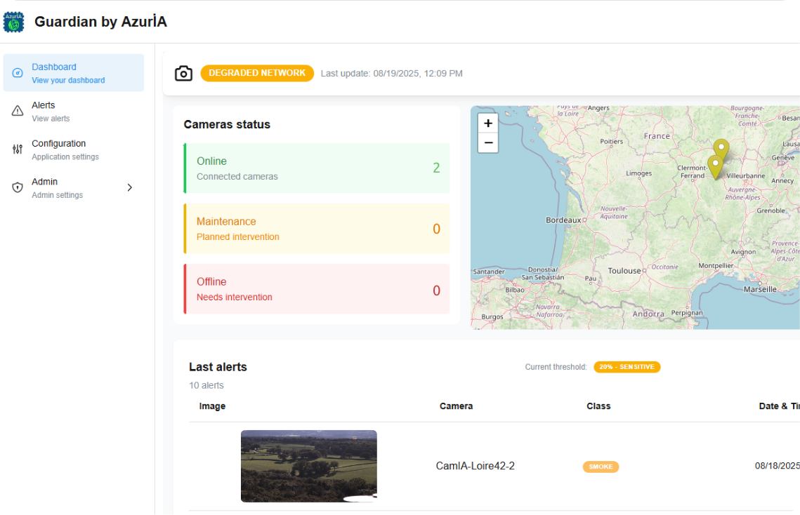 Deux boîtiers CamIA, développés par AzurIA, ont été installés à La Bénisson-Dieu et La Valla-sur-Rochefort. Équipés de notre IA embarquée, ces systèmes détectent en temps réel les incidents et transmettent les alertes au SDIS 42, permettant une réaction rapide et ciblée. L’interface homme-machine (IHM) permet aux équipes de visualiser les alertes, de contrôler les caméras et de suivre les événements en streaming, offrant un outil complet de supervision.